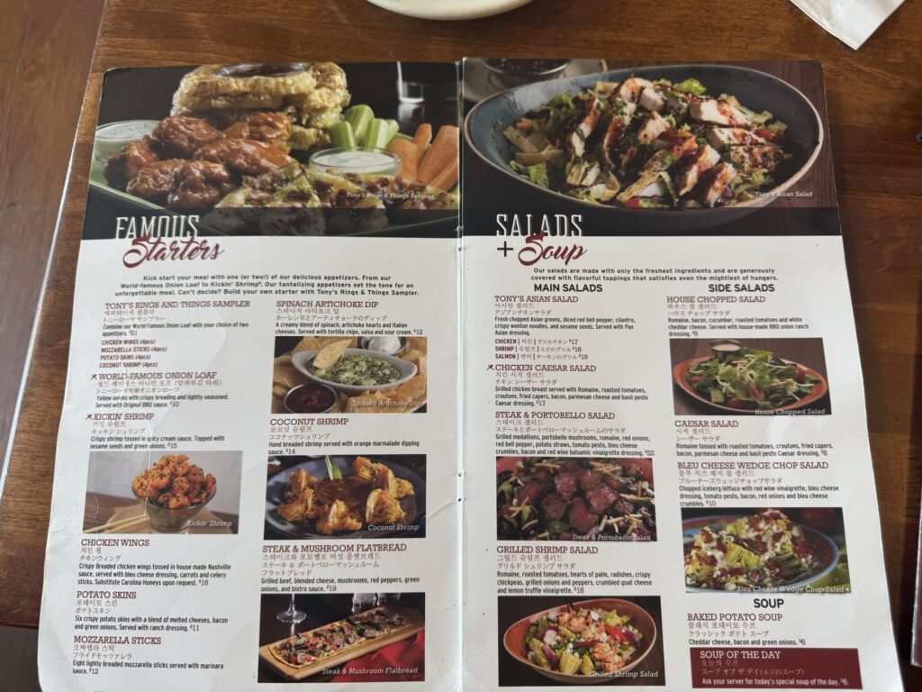 メインはだいたい20ドル台〜40ドル前後が目安です(リブやステーキはしっかり価格帯)。飲み物やデザートをつけるなら、もう少し余裕を見ておくと安心です。